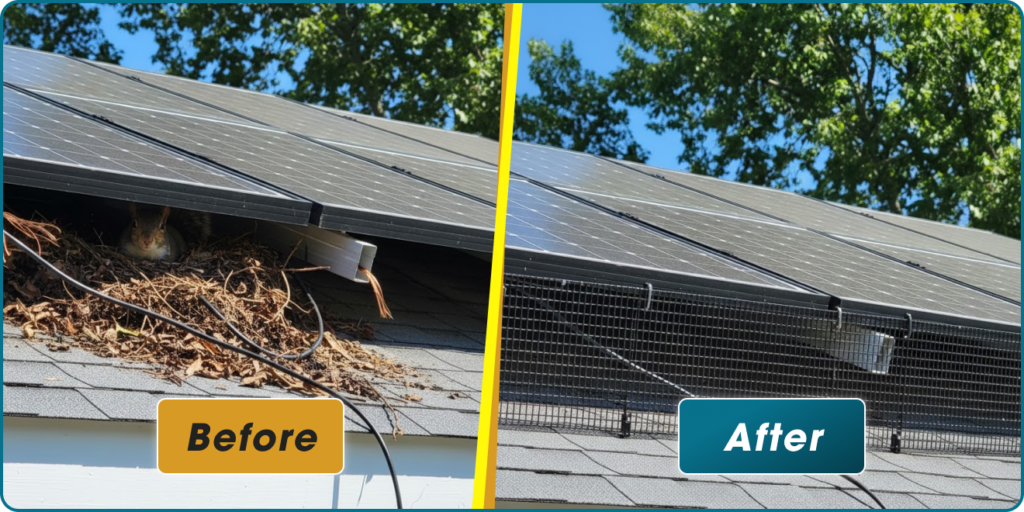 Our critter guard installation begins with clearing debris from beneath your solar panels, then sealing all gaps with a durable protective barrier. This prevents birds and rodents from nesting, protects DC wiring from damage, reduces moisture buildup, and helps avoid roof rot—keeping your solar system safe, efficient, and protected long term.